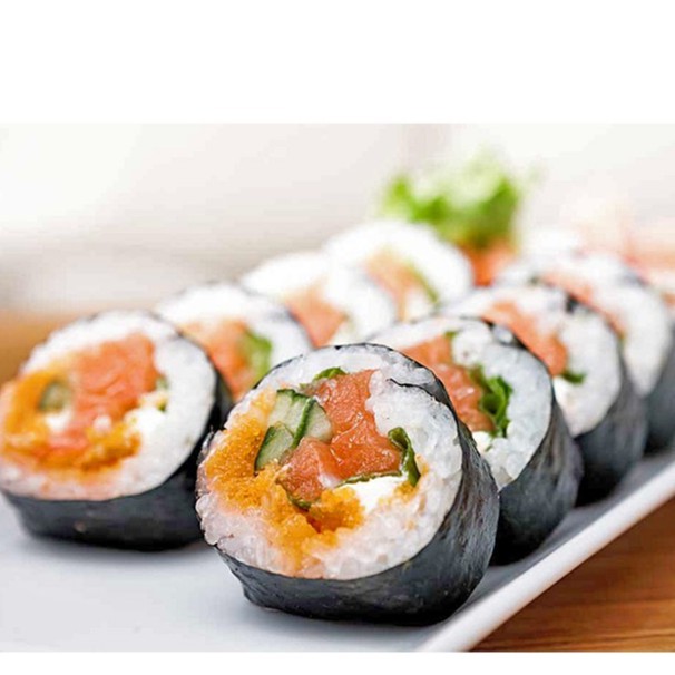 nguyên liệu chính là rong biển, cơm, và các loại nhân bạn ăn kèm như rau chân vịt, trứng, thịt , giò, xúc xích, cà rốt....Sushi thường được cuộn thành hình tròn và cắt miếng dễ ăn.