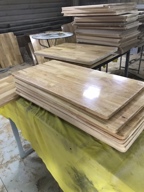 Sản phẩm làm từ gỗ cao su ghép thanh, phủ keo 2 mặt.Góc và cạnh được bo tròn, mai láng mịn, Sơn lót PU để bảo vệ lõi gỗ.
