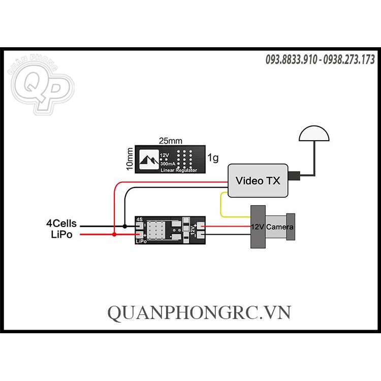 Mô tả:Đa số quadcopter sử dụng pin 2 ~ 4S LIpo, nhưng hầu hết các điện áp hoạt động của camera là 7 ~ 13V, sử dụng bộ điều chỉnh tuyến tính này có thể cung cấp 12V đến camera trực tiếp từ một pin lipo 4S.