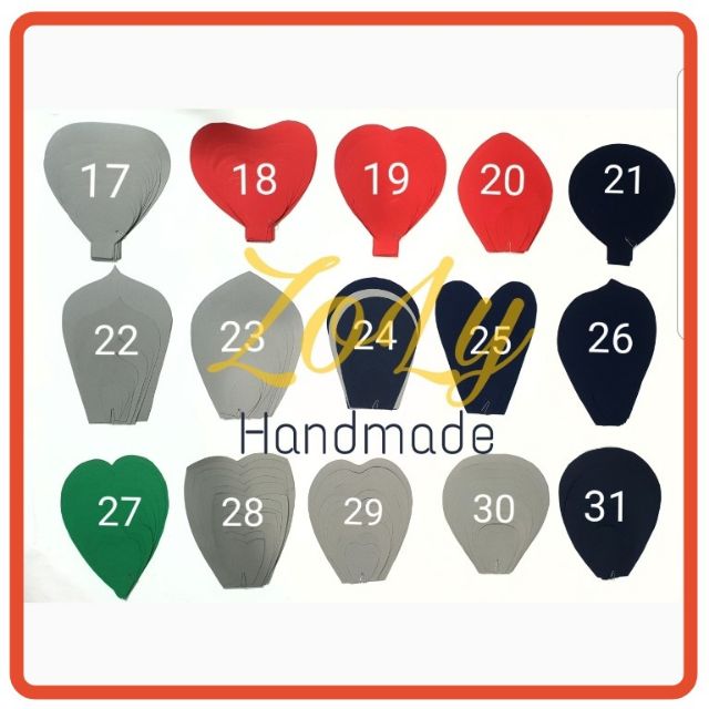 Bộ mẫu cánh hoa gồm 10-12 size cánh hoa mẫu của các lớp trong một bông hoa. Chất liệu giấy bìa.Dùng để ướm kích thước cắt giấy. Hoa size nhỏ dùng các mẫu cánh nhỏ liên tiếp nhau và tương tự đối với hoa lớn. Với bộ mẫu cánh hoa, các bạn có thể làm được hoa 40-45cm trở xuống. Giá 40K/ 1 bộ (1 mã số)