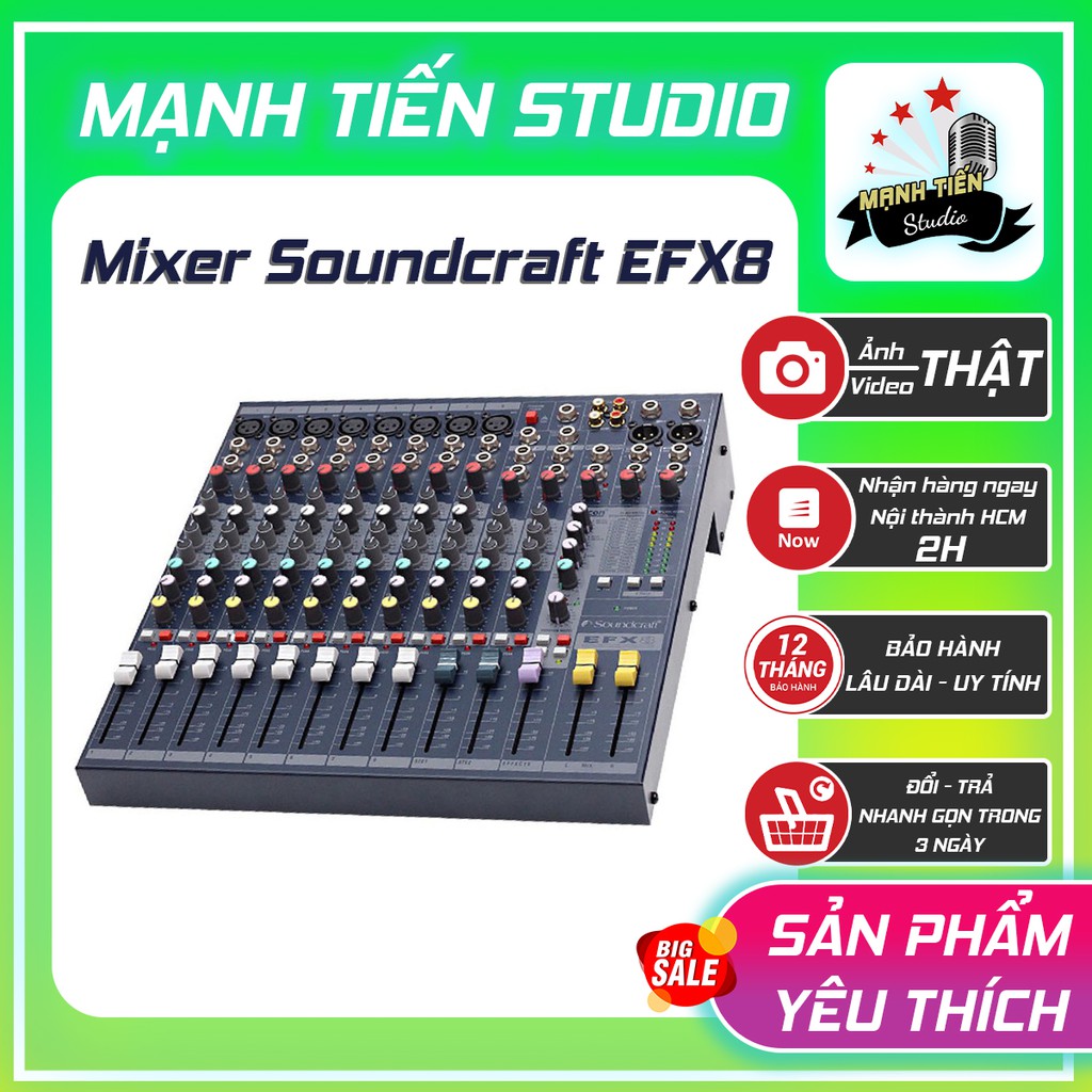 - Bàn trộn âm thanh Mixer Soundcraft EFX8 là một thiết bị khuếch đại âm thanh chuyên nghiệp, được sử dụng hầu hết trong các dàn âm thanh hội trường , âm thanh sân khấu, đám cưới… EFX8 là dòng mixer của Soundcraft với sự kết hợp nhiều tính năng phổ biến của các thế hệ mixer đi trước giúp người sử dụng dễ dàng hơn trong việc điều chỉnh tín hiệu âm thanh đầu vào.