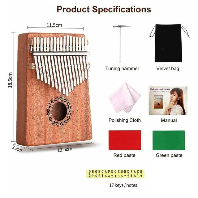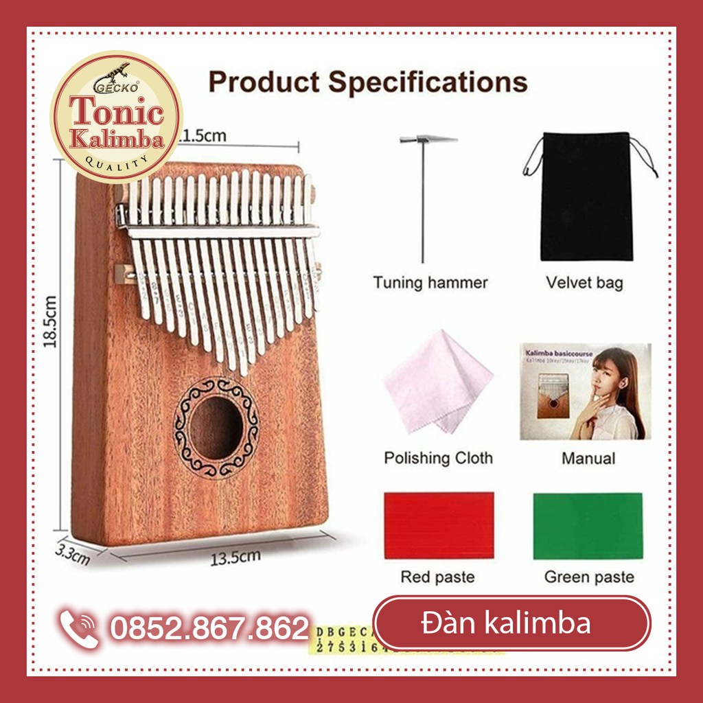 Phụ kiện Đàn Kalimba chính hãng đi kèm khi mua hàng bao gồm: Đàn, Búa chỉnh âm, Stiker dán nốt, Decal xanh và đỏ, Khăn lau, Túi đựng.Số phím: 17, Tone: C, Chất liệu: Gỗ Mahogany