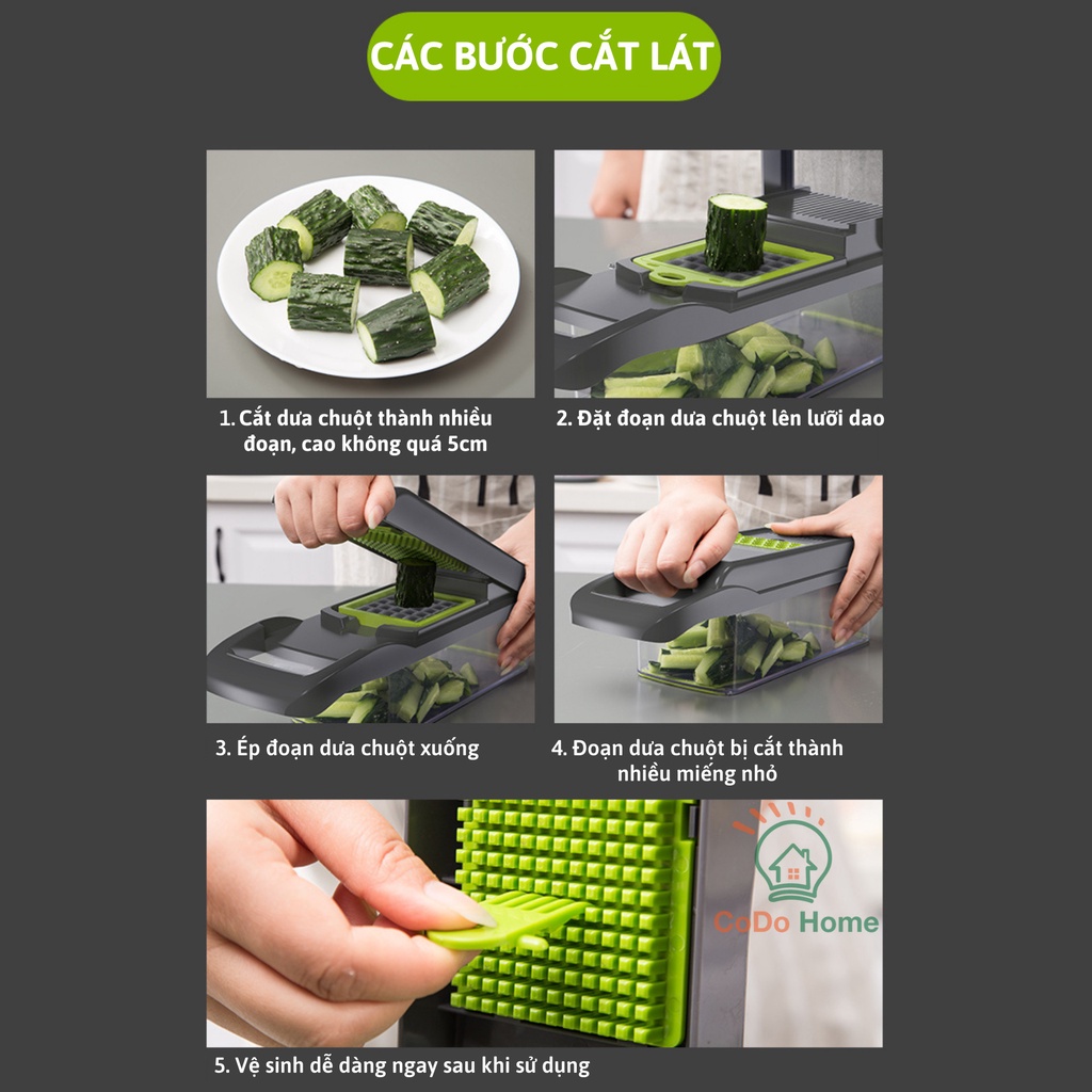 - với thiết kế thông minh, nhỏ gọn và nhiều chức năng gồm: tay cẩm chống trượt, đệm chống trượt, rổ thoát nước, những lưỡi dao sắc bén không gỉ