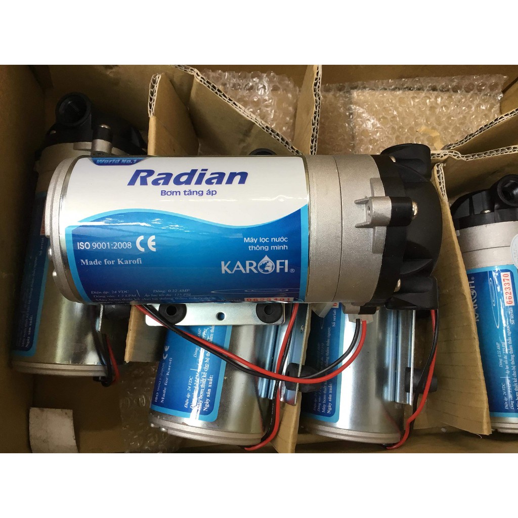 Bơm tăng áp Radian Karofi là sản phẩm được sản xuất độc quyền theo đơn đặt hàng của công ty Karofi Việt Nam. Trên đầu bơm có dòng chữ in nổi thương hiệu Karofi sắc nét, trên thân có tem bảo hành chính hãng Karofi. Bơm có độ bền cao, hút đẩy siêu khỏe. Sản phẩm Bơm tăng áp 24v Radian Karofi Chính hãng là sản phẩm tuyệt vời để lắp đặt cho các máy lọc nước RO hoặc giàn phun sương làm mát. Bơm được bảo hành lên đến 12 tháng bởi công ty Karofi Việt Nam.- Thương hiệu : Radian Karofi