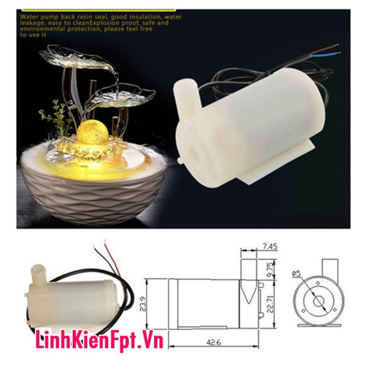 Máy bơm chìm mini với điện áp sử dụng trong khoảng 3-5 VDC, dùng bơm nước với độ xa lên đến 0.3m.