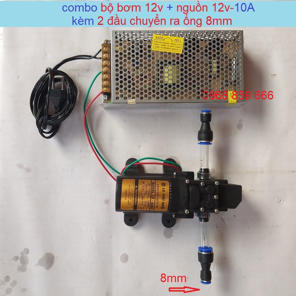 combo bộ bơm 12v + nguồn12v-10a + 2 đầu chuyển ra ống 8mmMáy bơm mini 12v
