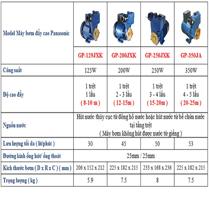 + Máy bơm nước Panasonic GP-200JXK là dòng máy bơm nước đa năng thích hợp để vận chuyển nước sinh hoạt trong gia đình như hút trực tiếp đường ống, hút từ bể ngầm, hút giếng khoan, giếng khơi… đến những nơi khác nhau.THÔNG SỐ KỸ THUẬT