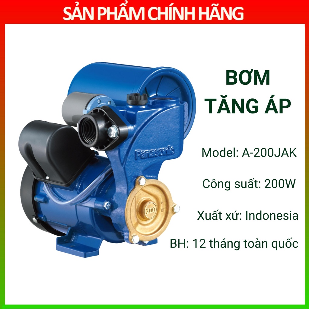 Máy bơm nước tăng áp Panasonic chính hãng với thông số chính như sau:- Model: A-200JAK