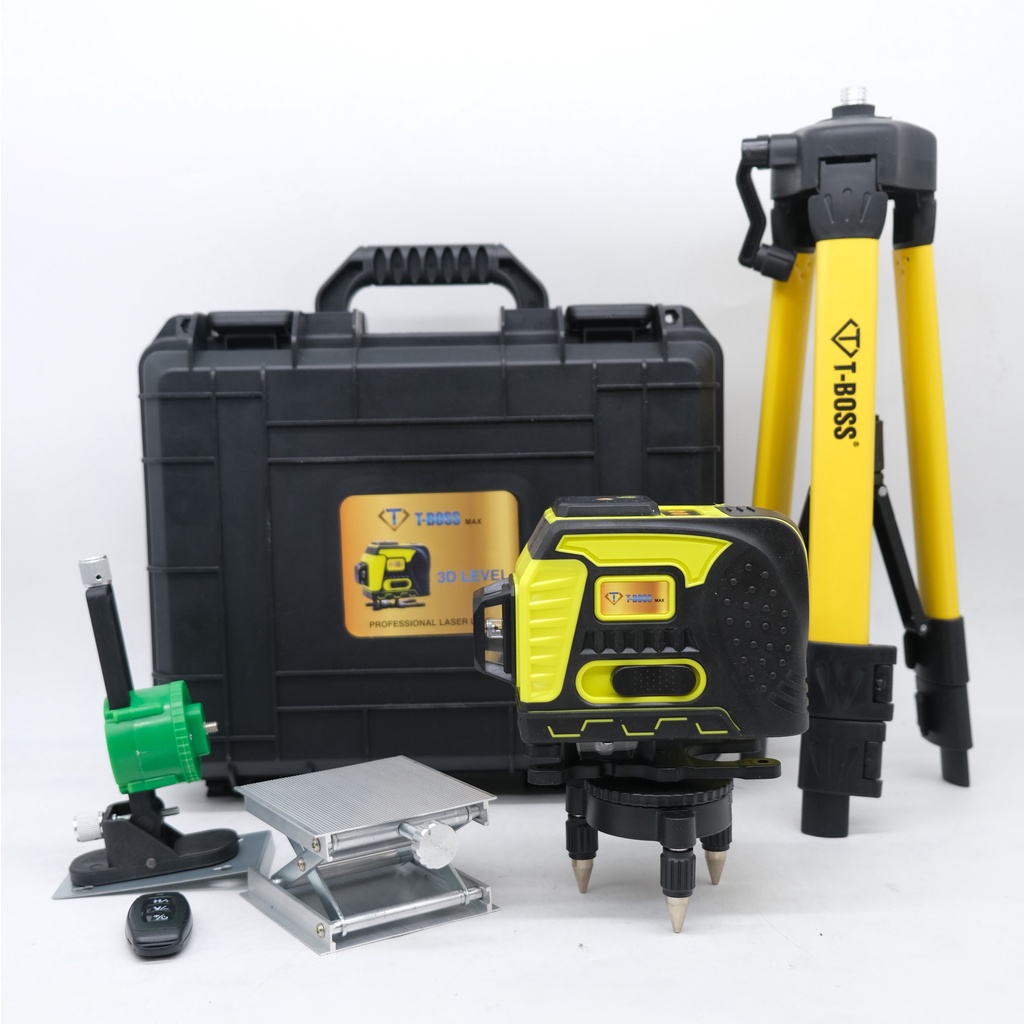 - Máy cân mực laser T-boss có điều khiển từ xa, giá treo, sạc pin, đế nâng, miếng kim loại gắn tường, hộp nhựa cứng
