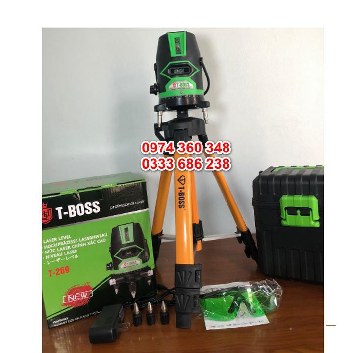 Đầu ra tia laser màu xanh 4 tia ngang, 1 tia dọc vuông góc nhau, 1 chấm laser dọi xuống