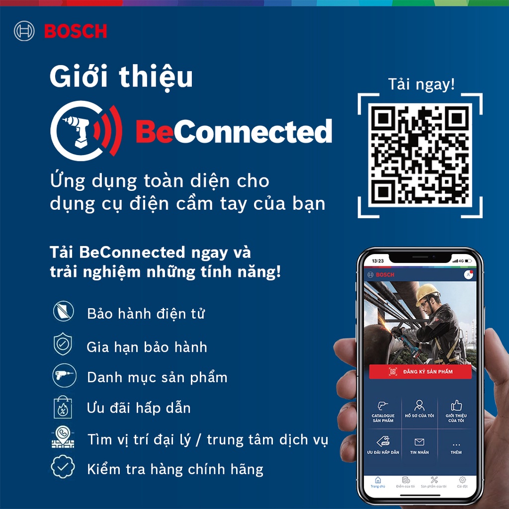 - Bước 1: Download ứng dụng “Bosch BeConnected” (màu xanh) trên App Store (cho iOS) hoặc Google Play (cho Android)