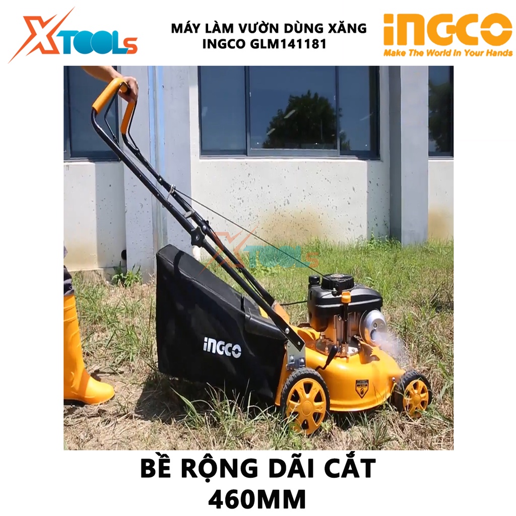 Máy cắt cỏ đẩy dùng xăng INGCO GLM141181 | máy làm vườn 3.0Kw(4HP), Động cơ 4 thì, chiều rộng cắt 460mm (18''), cắt cỏ,