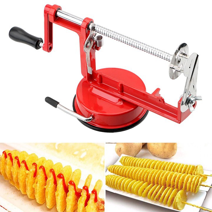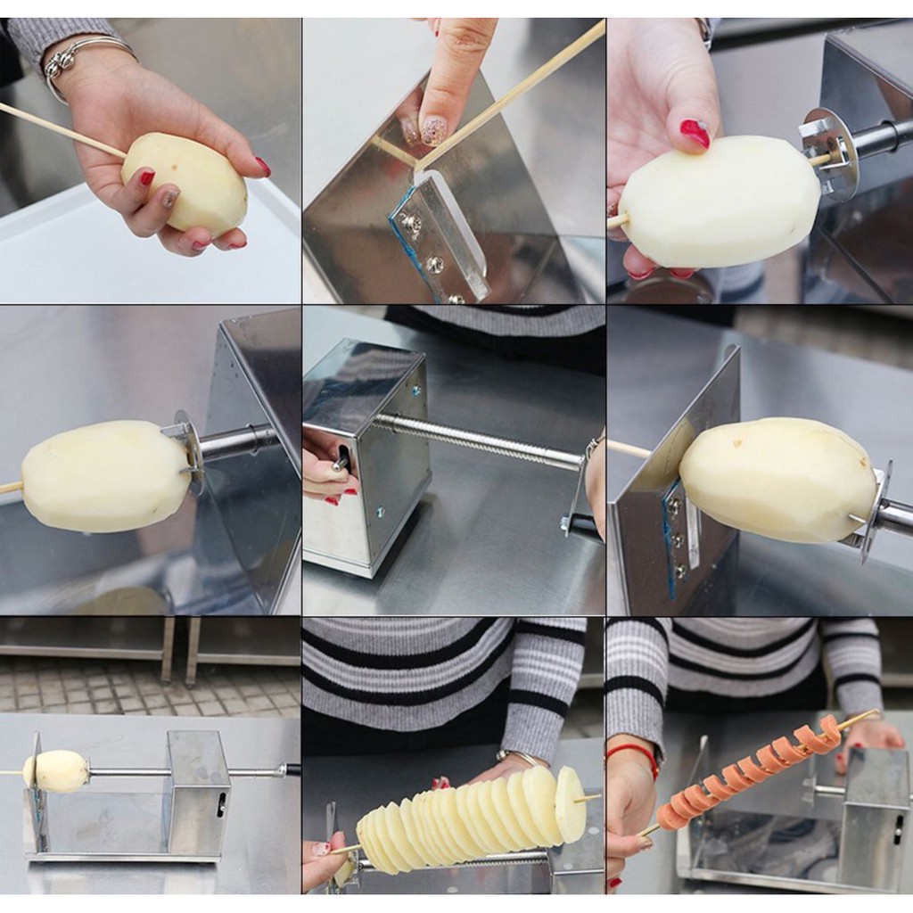 - Máy khoai tây lốc xoáy còn được gọi là máy cắt khoai tây xoắn vòng. Tháo lắp dễ dàng, kích thước nhỏ nhẹ, dễ vận chuyển và sử dụng