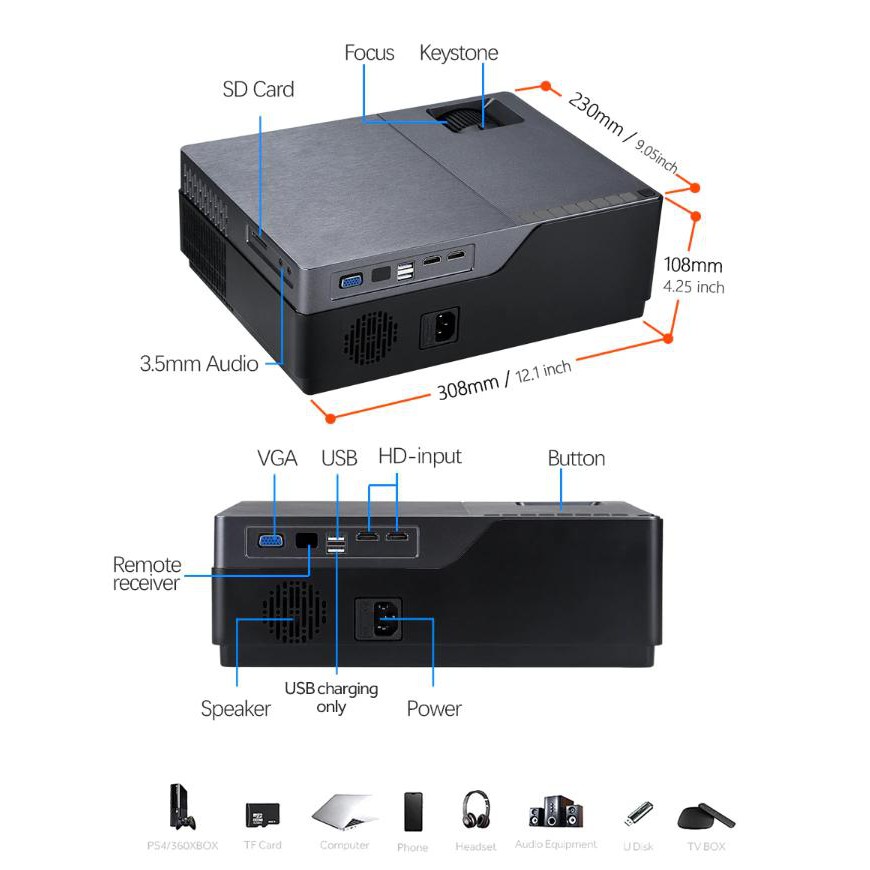 Đầu vào: USB * 2 (Một USB chỉ hỗ trợ sạc) , HDMI, VGA, AV