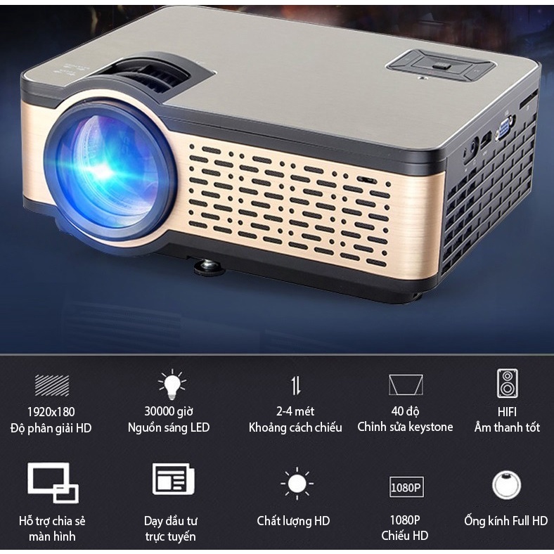 Hỗ trợ HDMI USB TF giắc cắm tai nghe AV có thể được liên kết với điện thoại di động, máy tính, dàn âm thanh nổi, đĩa U và ổ cứng di động. Máy chiếu siêu nhỏ, dễ dàng mang theo nhưng có thể lắp đặt với kích thước 100 inch là lựa chọn tốt để xem phim tại nhà, mang đi du lịch hay trình chiếu nội dung trong các cuộc họp.