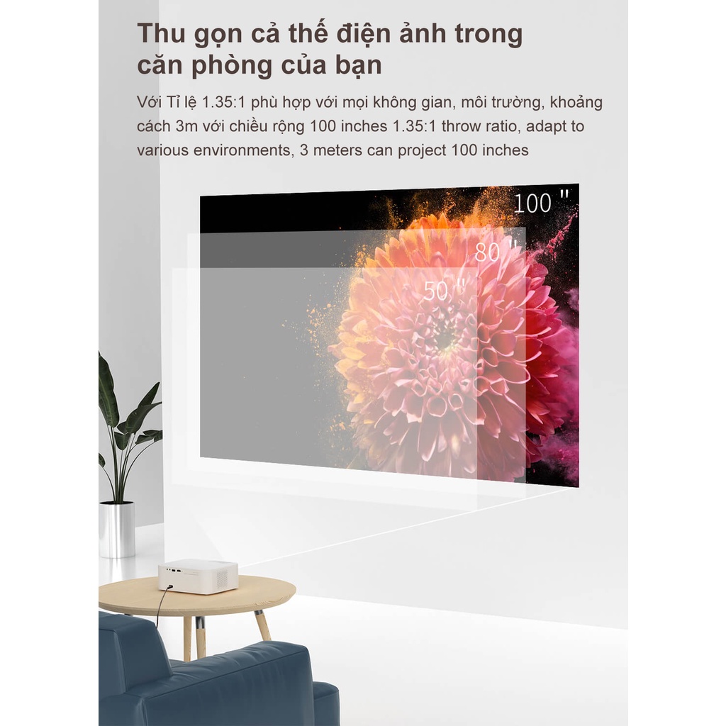 9. Tỷ lệ chiếu 1.35: 1, có thể chiếu hình ảnh kích thước nhỏ trong phòng nhỏ, khoảng cách 3 mét, có thể chiếu hình ảnh 100 inch.
