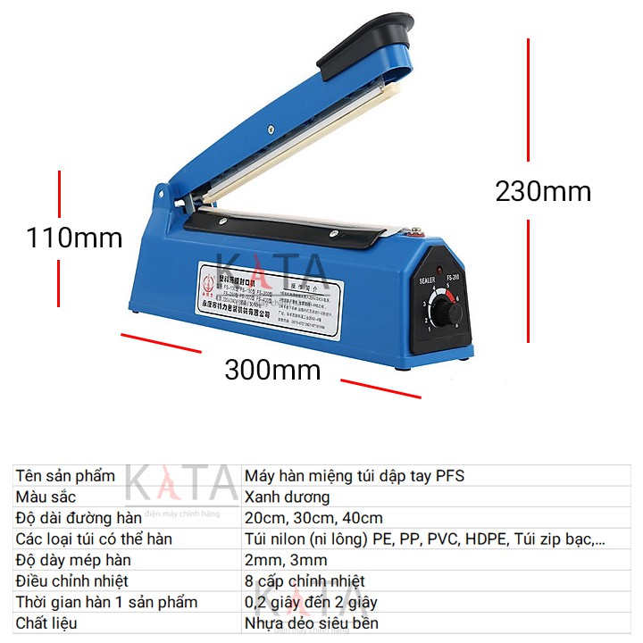 Máy dán miệng túi PFS-400 được thao tác bằng cách dập tay đơn giản, dễ dùng. Sản phẩm thiết kế màu xanh dương trang nhã, cấu tạo khá đơn giản