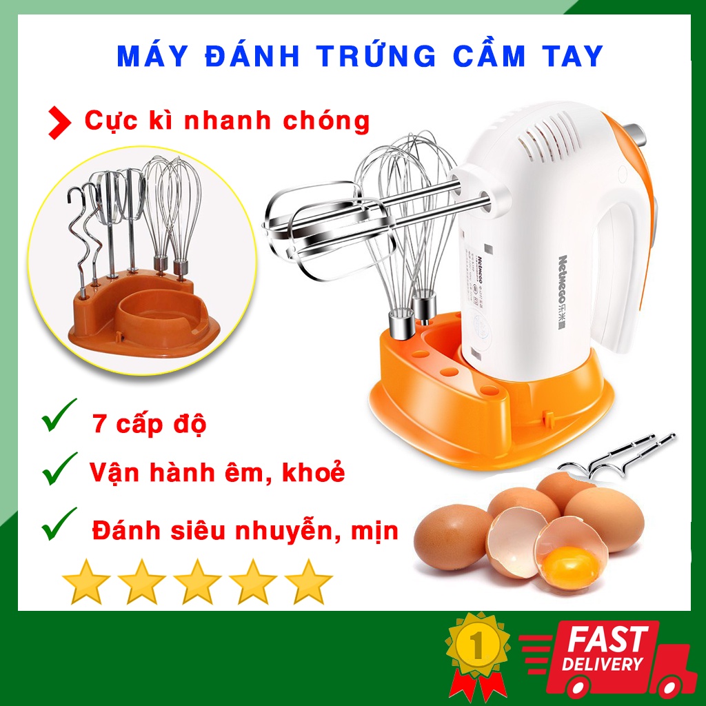 ✔️Máy đánh trứng cầm tay Netmego được làm với chất liệu nhựa chắc chắn, đi kèm máy là 6 que bằng inox cao cấp bền đẹp:2 que trộn, 2 que nhào, 2 que phới lồng.