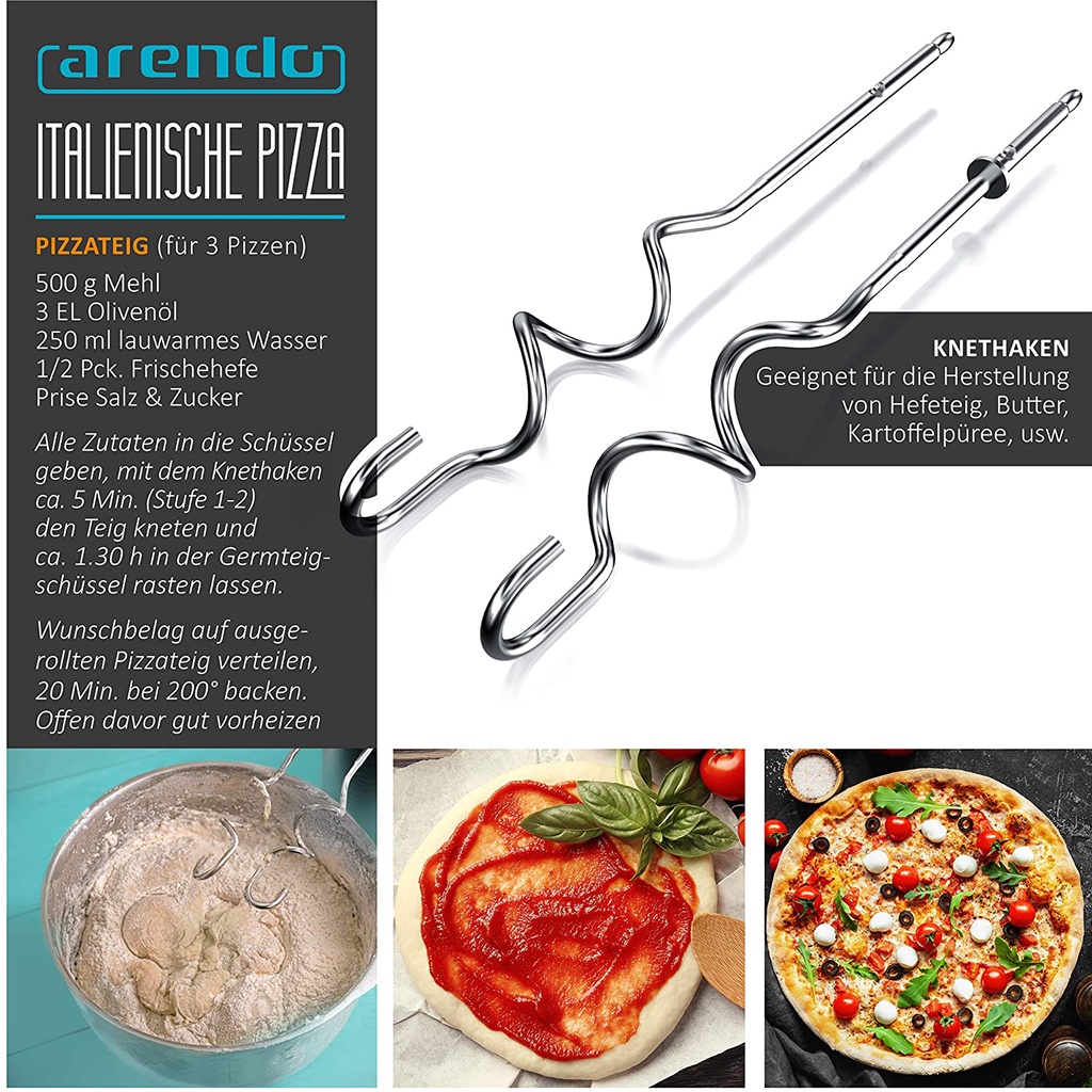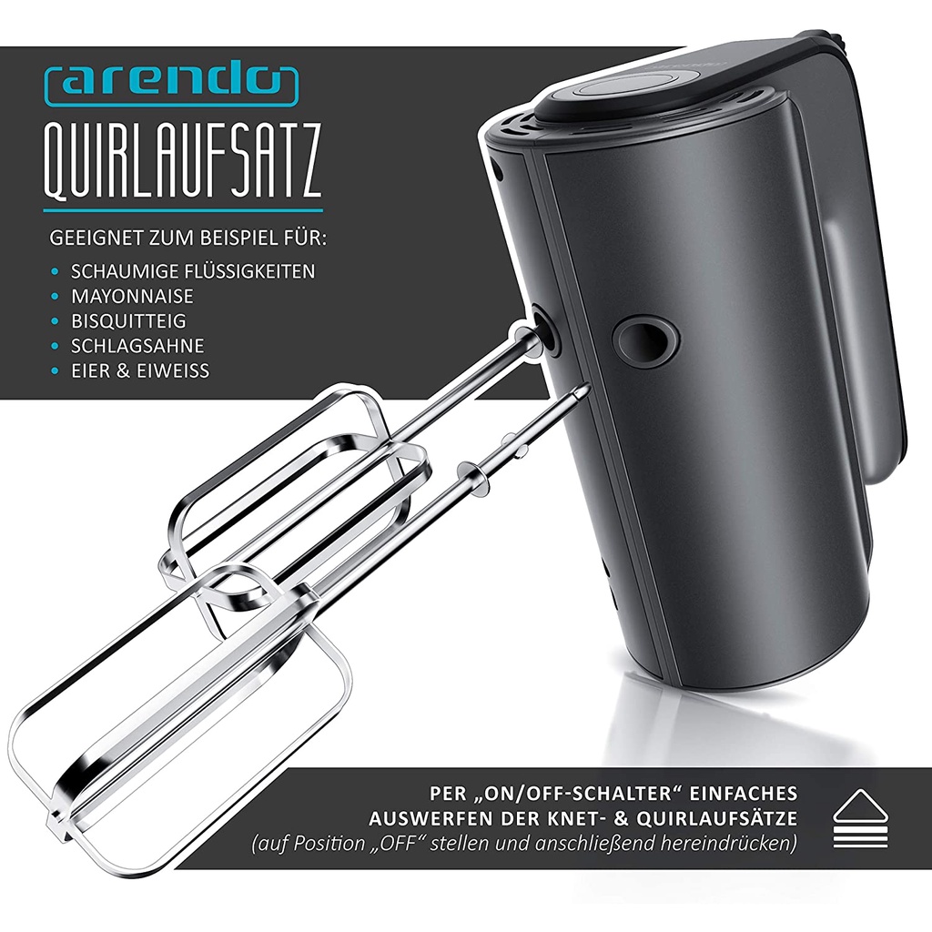 - Với máy trộn cầm tay Arendo, bạn có thể làm bột và nhào bột, lòng trắng trứng, kem đánh bông và nhiều hơn nữa.