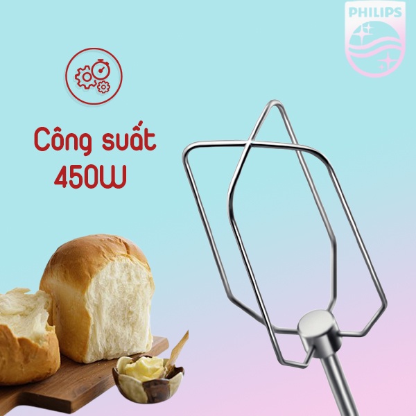 - Máy đánh trứng Philips có động cơ 450W mạnh mẽ đảm bảo kết quả mượt mà, không vón cục.