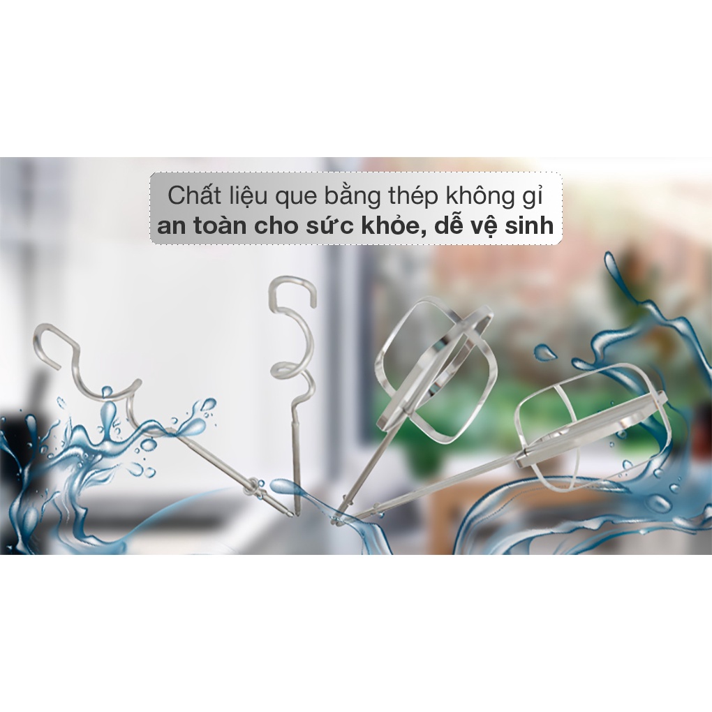 Máy đánh trứng có 2 que đánh trứng, 2 que đánh bột bằng chất liệu thép không gỉ sáng bóng, bền bỉ, dễ tháo rời làm sạch, tiện lợi