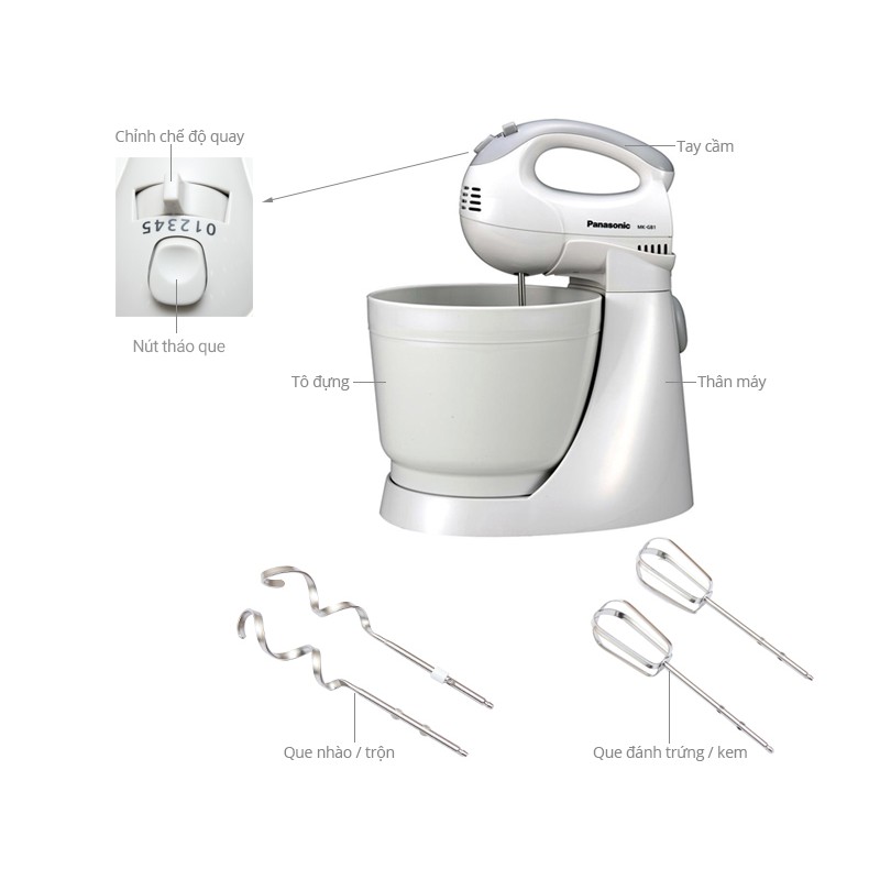 - Chức năng: Đánh bột, Đánh trứng, Nhào trộn, Đánh kem