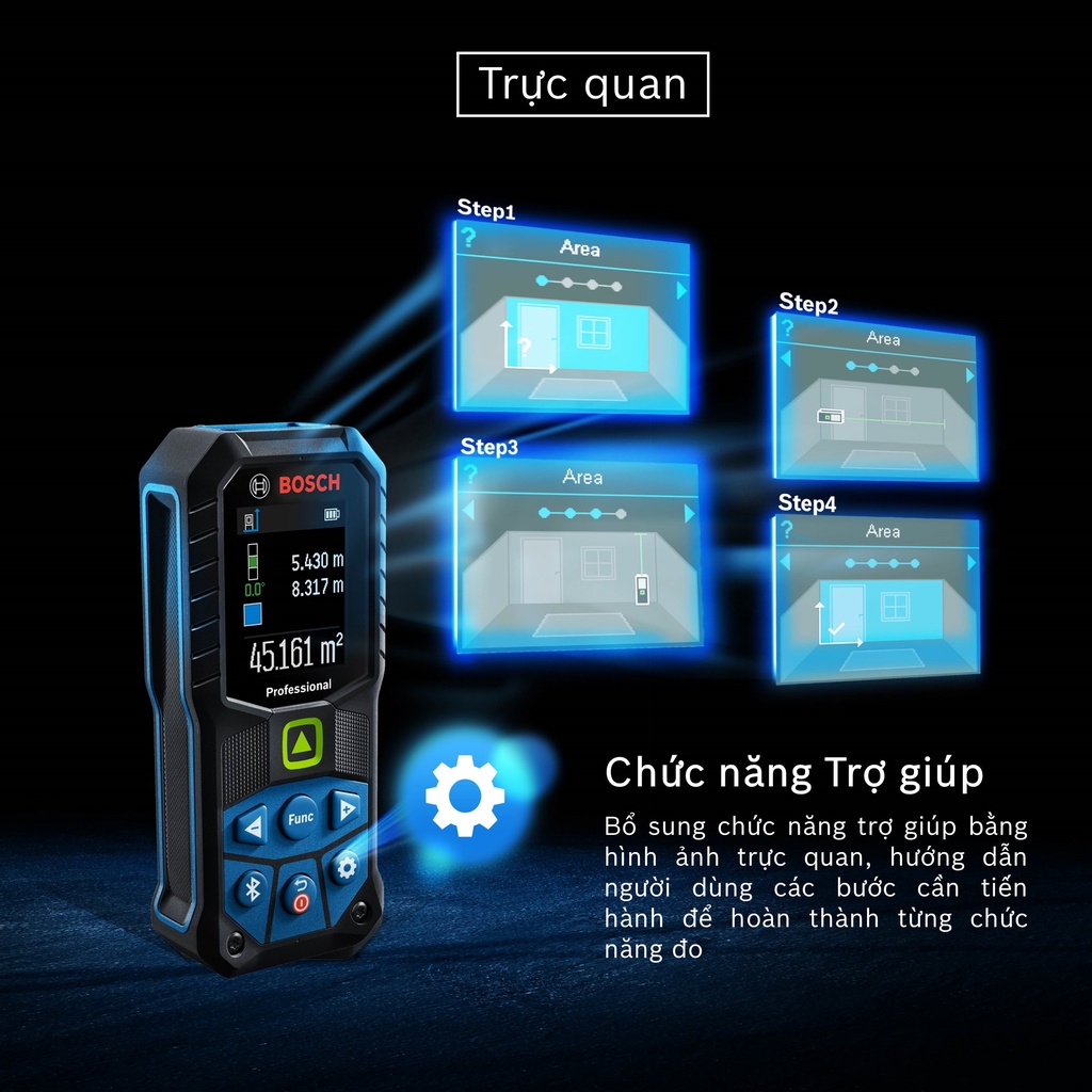 - Máy đo khoảng cách laser ĐẦU TIÊN của Bosch sở hữu điểm laser XANH, tăng độ hiện thị lên gấp 4 lần