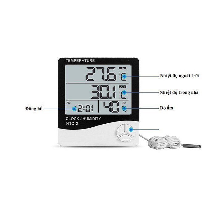 Máy đo nhiệt độ độ ẩm trong phòng Model HTC-2 vừa làm đồng hồ xem thời gian, vừa hiển thị chính xác nhiệt độ và độ ẩm tại nơi đặt chiếc máy này và nơi đặt cảm biến nhiệt độ rời ngoài thân máy.THÔNG SỐ KỸ THUẬT: