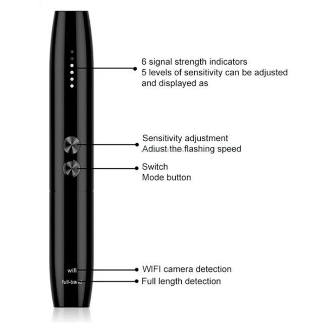 5. phát hiện Laser: Bạn có thể nhìn xuyên qua cửa sổ máy chủ, tất cả các ống kính máy ảnh trong đường ngắm. Nó không dây có thể quét: phạm vi phát hiện tần số (1MHz-6.5GHz). điện áp thấp chức năng nhanh chóng, được xây dựng trong pin có thể sạc lại.