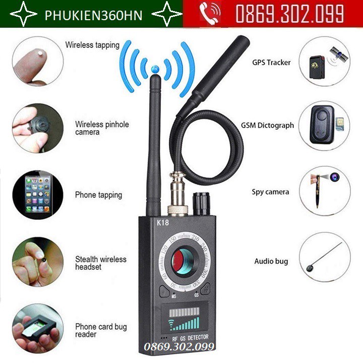 Máy dò phát hiện theo dõi K18 hỗ trợ phát hiện ra một loại sóng vô tuyến, camera quay lén, máy ghi âm, thiết bị định vị và từ trường. Đặc biệt, loại máy này còn hỗ trợ người dùng phát hiện ra lỗi của thẻ sim dành cho điện thoại di động. Một ưu điểm nữa mà người dùng sẽ cảm thấy rất tiện ích đó chính là máy còn có khả năng phát hiện ra các loại camera ẩn không dây siêu nhỏ
