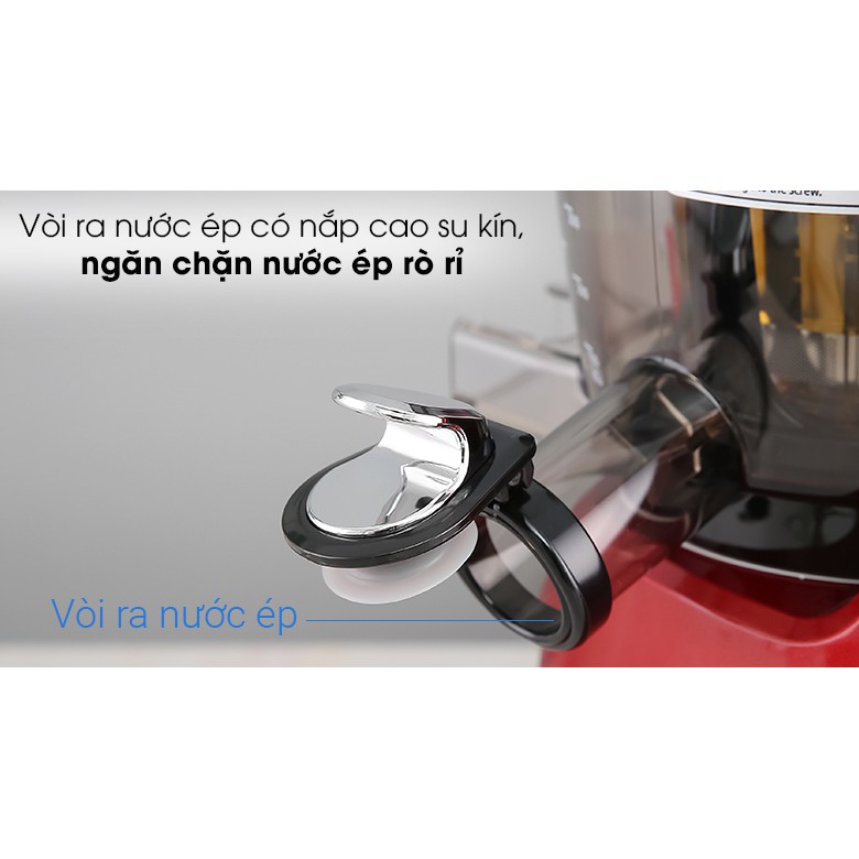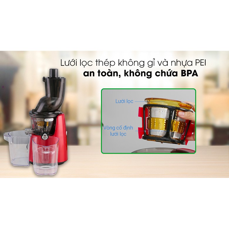 Bình chứa được làm bằng Tritan không chứa hormone môi trường (Bisphenol A), lưới nước ép được làm bằng chất liệu ULTEM an toàn và bền.