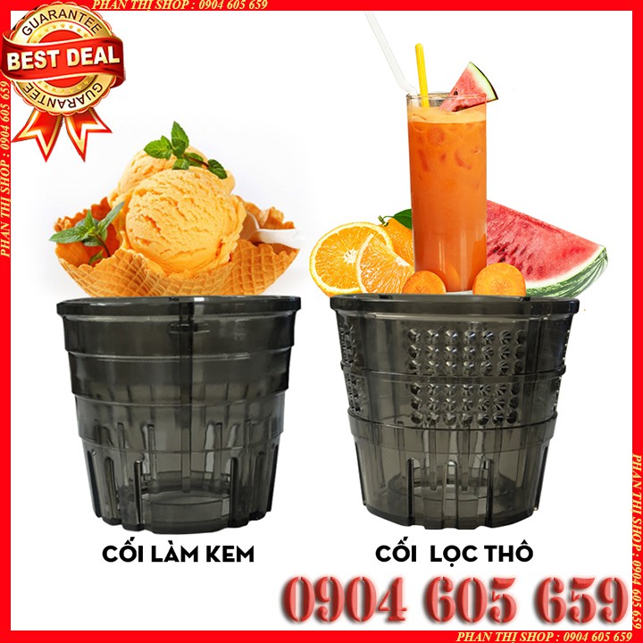 - Bộ sản phẩm gồm: Máy ép, cối ép, cối lọc bã, cối làm kem, 2 hộp đựng bã và nước ép