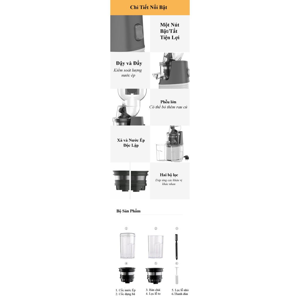 - Bộ sản phẩm : Đầu vào; Đế; Lõi lọc lỗ to; Lõi lọc lỗ nhỏ; Thanh Đẩy; Cốc bã; Cốc nước ép; Trục xoay; Thân máy; Bàn chải vệ sinh; ống bơm chân không lưu trữ