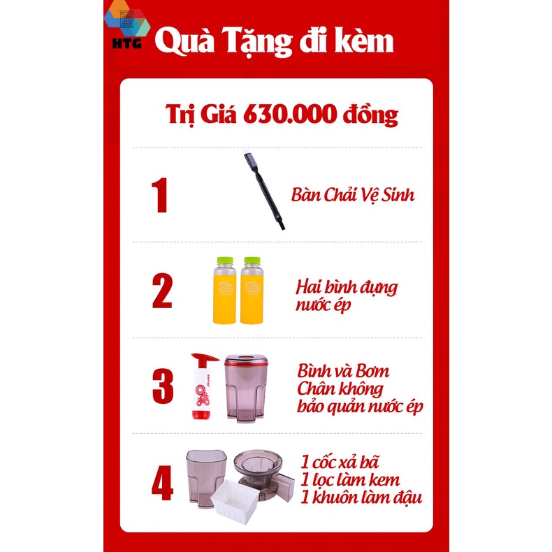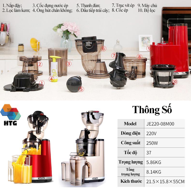 💥Bộ sản phẩm : 1. Nắp đậy; 2.Lọc làm kem; 3. Cốc đựng nước ép; 4. Ống hút chân không ; 5. Thanh đùn; 6. Đầu tiếp nguyên liệu; 7.Trục vít ép; 8. Cốc ép chống oxy hóa; 9. Máy chủ; 10. Bộ lọc