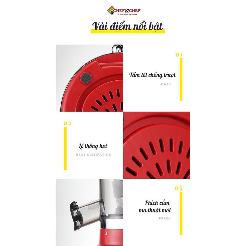 Máy ép nguyên quả tốc độ chậm CHEF&CHEF thiết kế nhỏ gọn, đẹp mắt, có độ bền cao, nhiều màu sắc