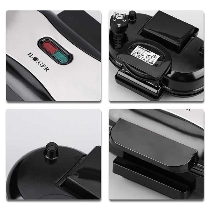 - Máy nướng bánh mì HAMBURGER HAEGER được làm bằng chất liệu nhựa ABS, thép không gỉ và thiết kế hiện đại, sáng tạo với 2 mặt nướng lớn giúp bạn nướng 2 miếng bánh hamburger cùng một lúc. Máy nướng bánh hamburger để nướng các miếng bánh Hamburger đều và ít chất béo. Sử dụng đa năng để nướng bánh mì, bánh mì kẹp thịt, bánh cá, v.v.