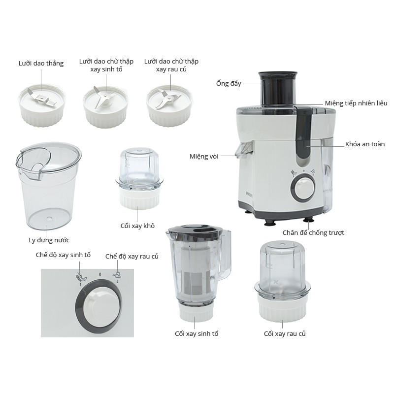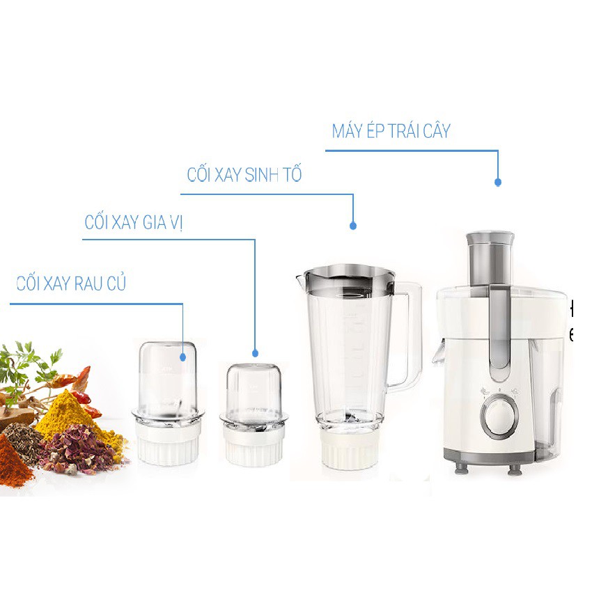 - Máy xay ép đa năng Philips HR1847 được trang bị 1 máy ép trái cây, 1 cối xay sinh tố 1 lít, 1 cối xay thực phẩm khô 0.2 lít và 1 cối nhỏ 0.1 lít dùng để xay ớt, xay hành... đáp ứng đầy đủ nhu cầu làm bếp của bạn.
