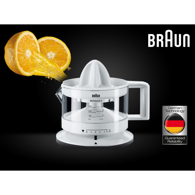 - Máy vắt cam Braun CJ3000, bạn chỉ cần xoay bình đựng theo mức điều chỉnh lượng tép cam, máy vắt sẽ dễ dàng cho bạn một kết quả như mong muốn với những ly cam tươi ngon, bảo đảm an toàn.