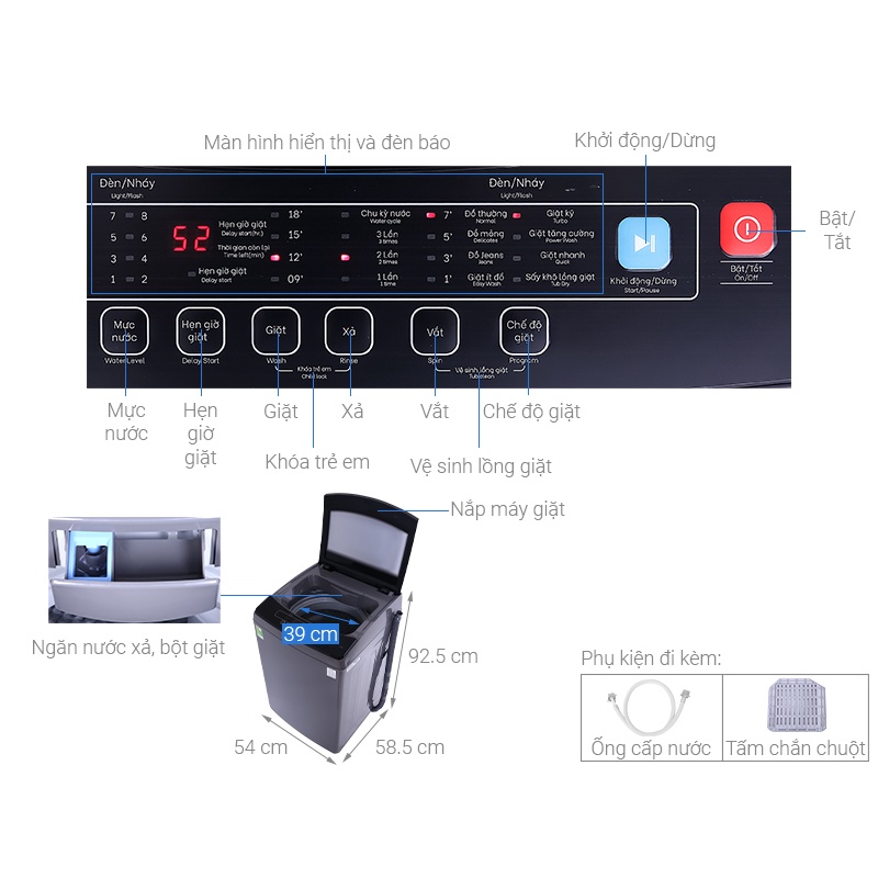 Bảng điều khiển tiếng Việt (nút bấm) dễ dàng thao tác và sử dụng. Kích thước RxSxC: 550x565x960 (mm); trọng lượng: 40kg.