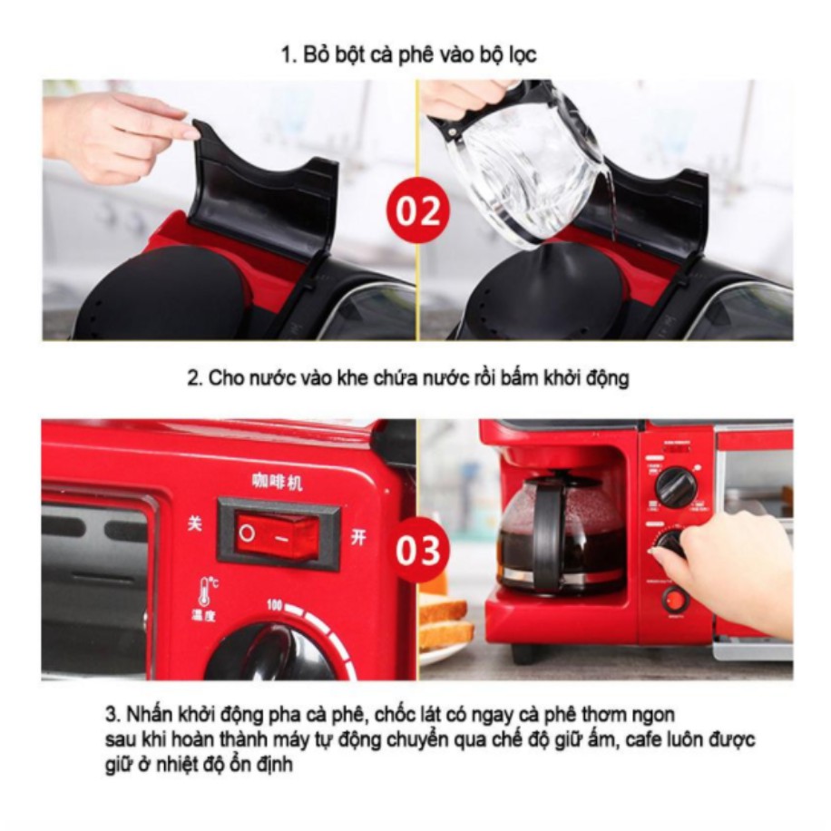 Chiếc máy xinh xắn này sẽ giúp bạn có bữa sáng ngon lành nóng hổi và cà phê chỉ với những thao tác vô cùng đơn giản.Sản phẩm là một chiếc máy tích hợp lò nướng, máy pha cà phê và chảo rán. Lò nướng cửa lật 2 tầng có thể dùng để nướng bất kỳ loại bánh nào làm từ bột mỳ. Rán bánh kếp, xúc xích, chả hoặc trứng trên chảo và pha cà phê cùng lúc với nướng bánh. Với máy làm bữa sáng 3 trong 1, những món ăn đơn giản sẽ sẵn sàng chỉ sau vài phút.