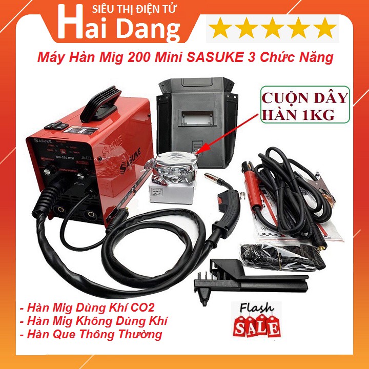 - Máy hàn Mig không dùng khí SASUKE 200 mini 3 chức năng với dòng hàn 200A giúp dễ mồi hồ quang điện, hồ quang cháy êm, mối hàn được bóng đẹp, ngấu.