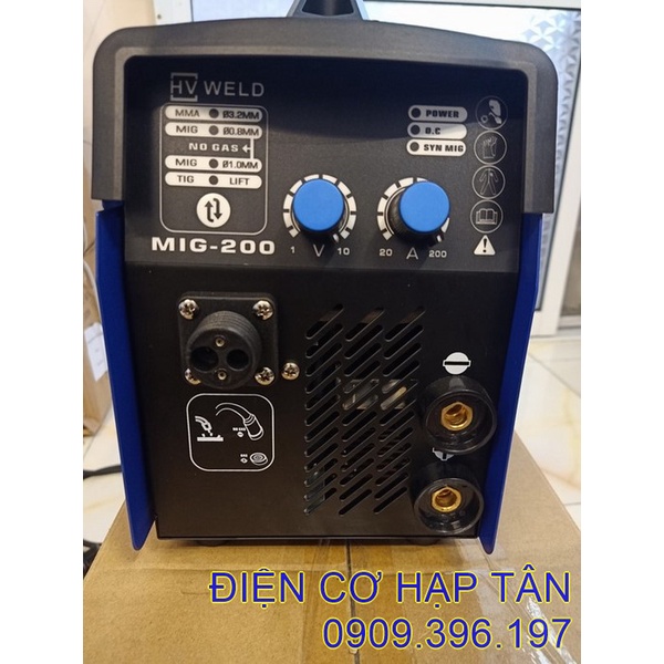 - Máy hàn Mig không dùng khí HV WELD 200 mini 4 chức năng với dòng hàn 200A giúp dễ mồi hồ quang điện, hồ quang cháy êm, mối hàn được bóng đẹp, ngấu.