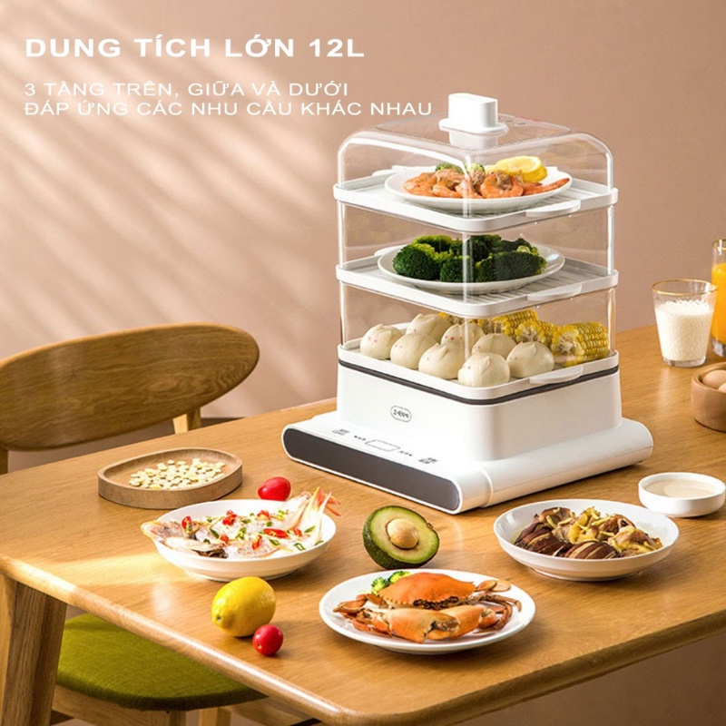 - Máy hấp điện ZHENMI ZMZG-02 được trang bị dung tích đến 12L kết hợp với thiết kế hấp 3 tầng độc đáo trên, giữa và dưới. Từ đó, người dùng có thể thoải mái hấp toàn bộ thực phẩm gồm rau củ, hải sản, thịt, trứng,...chỉ trong thời gian ngắn, tiết kiệm thời gian và công sức. Thích hợp chế biến món ăn trong các bữa tiệc, họp mặt gia đình, bạn bè hay đơn giản là bữa ăn thường ngày ở gia đình đông người.