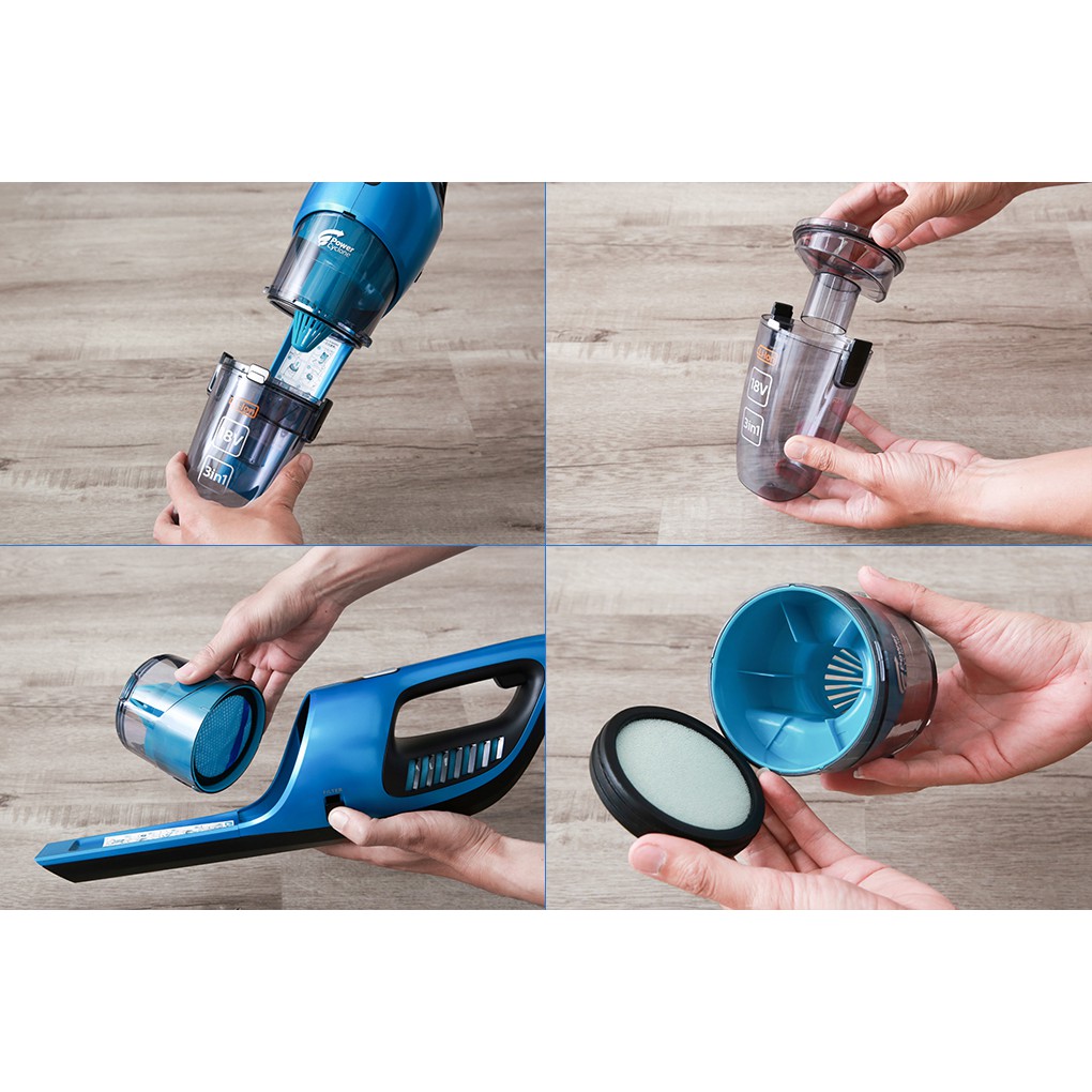Máy hút bụi cầm tay gọn đẹp, dễ dùng, dung tích hộp chứa bụi 0.6 lít.
