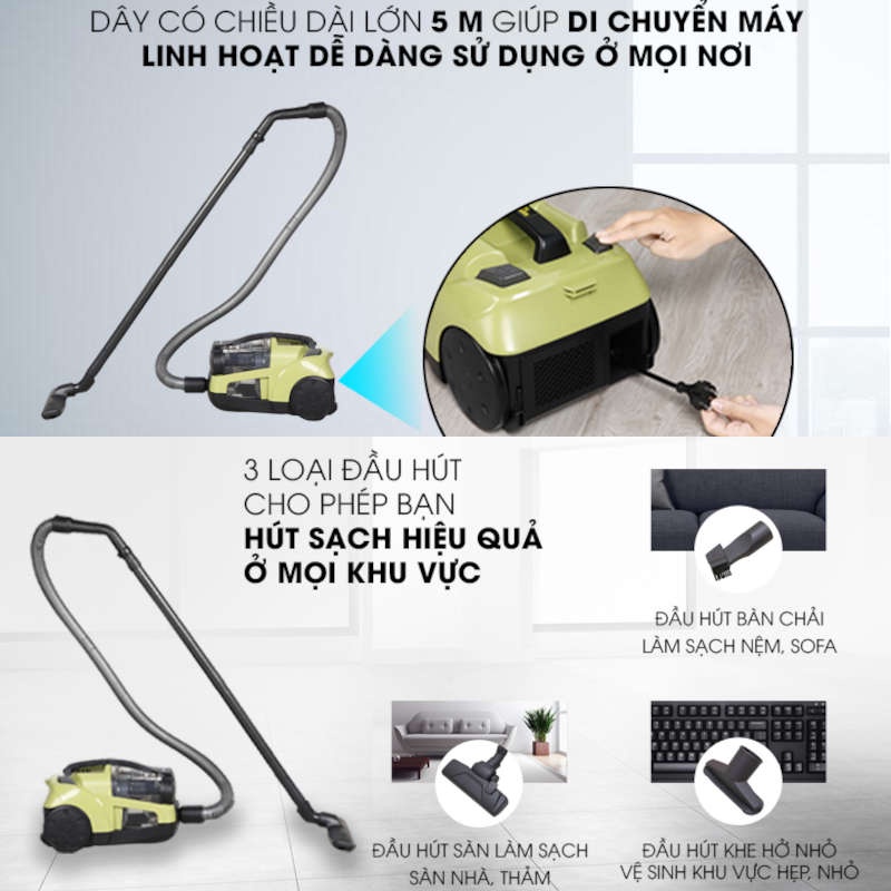 - Máy hút bụi dạng hộp với dây điện dài 5m, dễ di chuyển, làm sạch cả không gian rộng như phòng khách, phòng ngủ lớn.