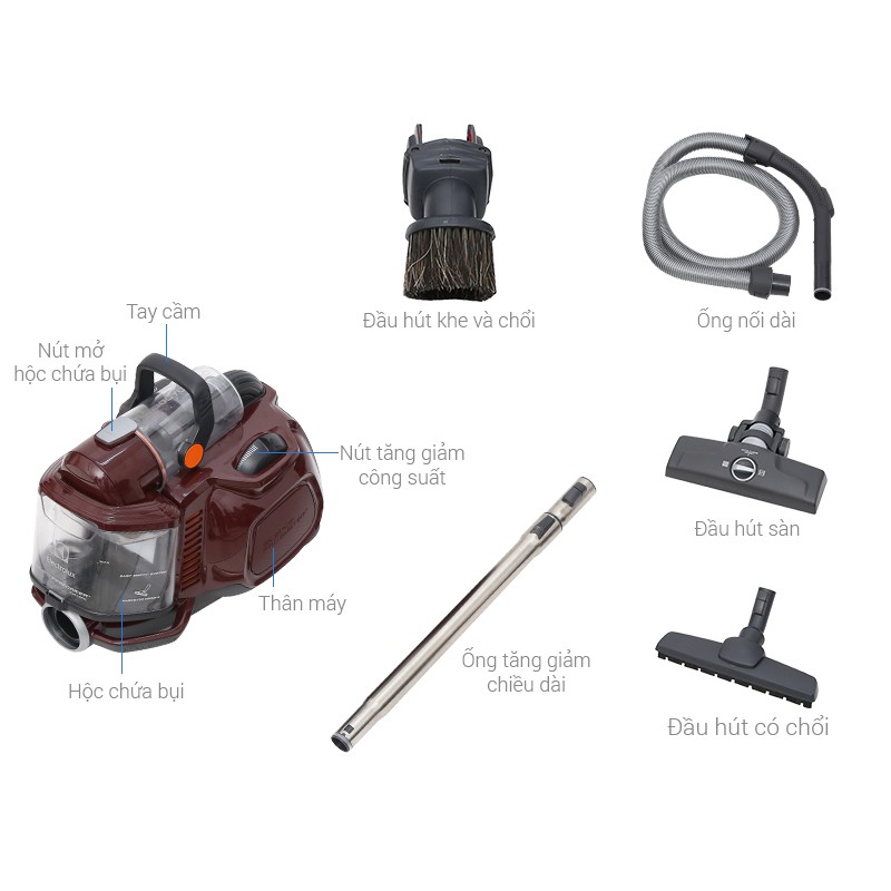 Phụ kiện: Đầu hút sàn, đầu hút khe và chổi kết hợp, đầu hút Turbo.