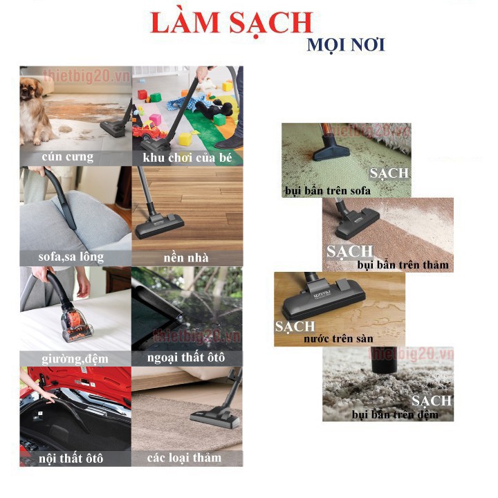 PHỤ KIỆN ĐI KÈM : Ống mềm, 2 ống nối , miệng hút , chổi 90 độ , cục lọc bụi ( giảm ồn)