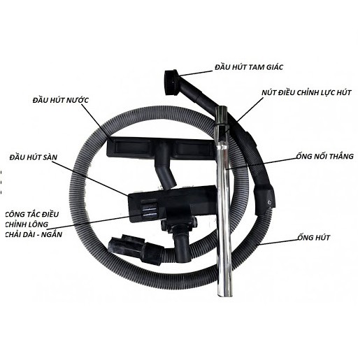 Đi kèm theo Máy hút bụi này là các đầu hút cực kỳ đa dạng: Đầu hút sàn, Đầu hút tam giác (Hút khô), Đầu hút nước, Đầu hút các khe nhỏ (như sofa, ngõ ngách nhỏ...)