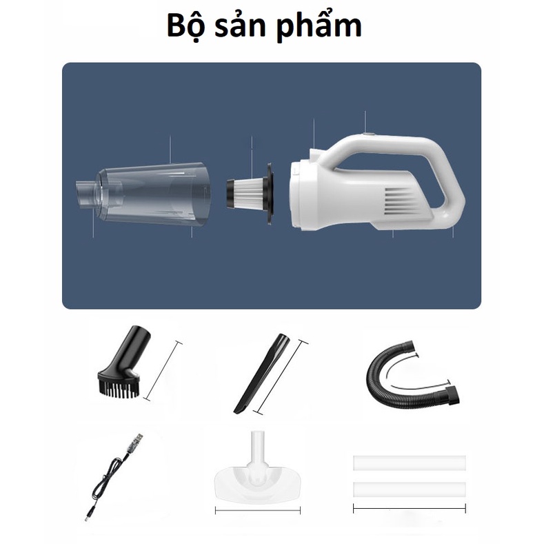 - Lực hút: 12000Pa, Công suất: 120W, Pin: 6000Mah, Bản sạc: USB, Dung tích khoang chứa: 0.53L.