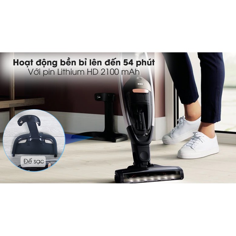 Tiện ích:Chế độ tiết kiệm pin, Công nghệ hút xoáy Cyclonic xử lý và nén bụi hiệu quả, Thiết kế dạng 2 trong 1 (có thể tháo rời sử dụng như máy hút bụi cầm tay), Tự đứng, Điều khiển trên tay cầm